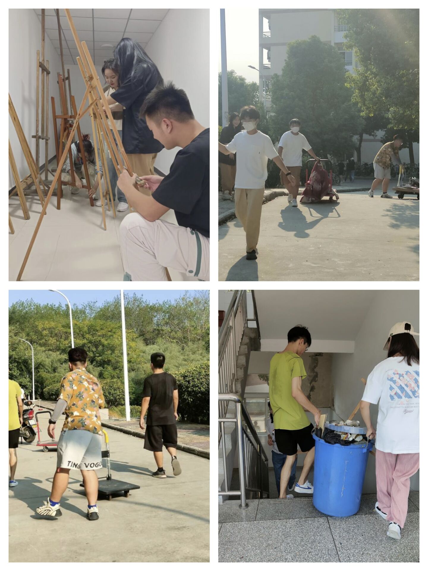除了教室的大扫除,9月21日,公司员工们还自发组织在来到教学楼各画室维修破损画架。短短两个小时,7位同学用自己的“巧手”将十几个画架“变废为宝”。谈及活动初衷,动画专业2021级的汪润表示,新生军训即将结束,随之而来的便是专业课的学习,画架是美术生学习的重要工具,自己发现许多画架还能“抢救”,便自发组织了“维修小分队”,希望能给新生们一个更好的学习体验。
