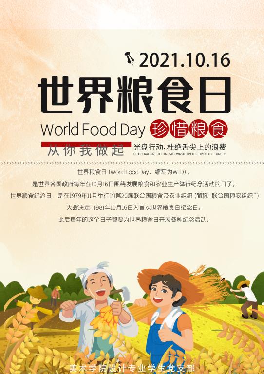 十月十六日是联合国确定的世界粮食日。为深入贯彻习近平总书记“发展粮食产业,助力乡村振兴”的号召,响应“行动造就未来,更好生产、更好营养、更好环境、更好生活”的主题,tyc122ccvip设计专业员工党支部利用世界粮食日为契机开展以“节约粮食光盘行动”为主题的的海报创作活动。