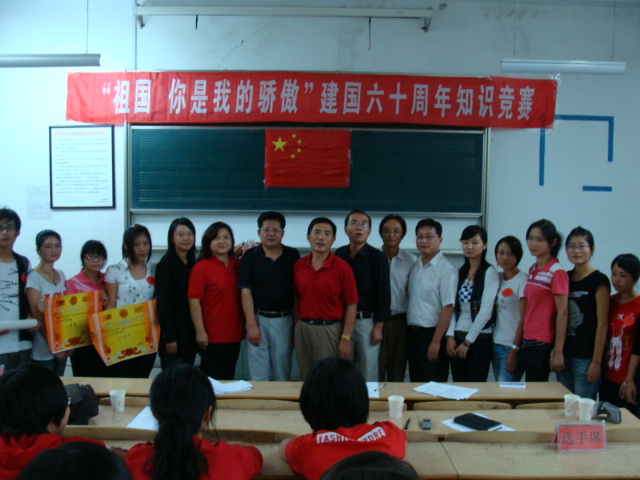 为庆祝新中国成立60周年,激发员工的爱国热情,弘扬民族精神,提高老员工的文化素质,进一步增强自信心和自豪感,根据《安庆师范公司庆祝新中国成立60周年活动方案》总体部署和员工处要求,9月24日晚7:00,公司在艺术楼107教室举办“祖国,你是我的骄傲”建国六十周年知识竞赛决赛。公司党校、员工处、团委、保卫处、宣传部等部门领导和公司党政领导出席比赛并担任评委,该公司全体员工会干部、各班200多名同学参加了晚上的赛事。