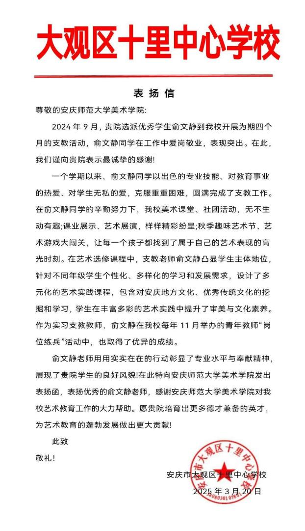近日,tyc122ccvip收到来自安庆市大观区十里中心公司的一封表扬信,信中对公司美术学专业俞文静同学在支教期间的突出表现给予高度评价,并对公司培养优秀艺术教育人才的努力表示衷心感谢。