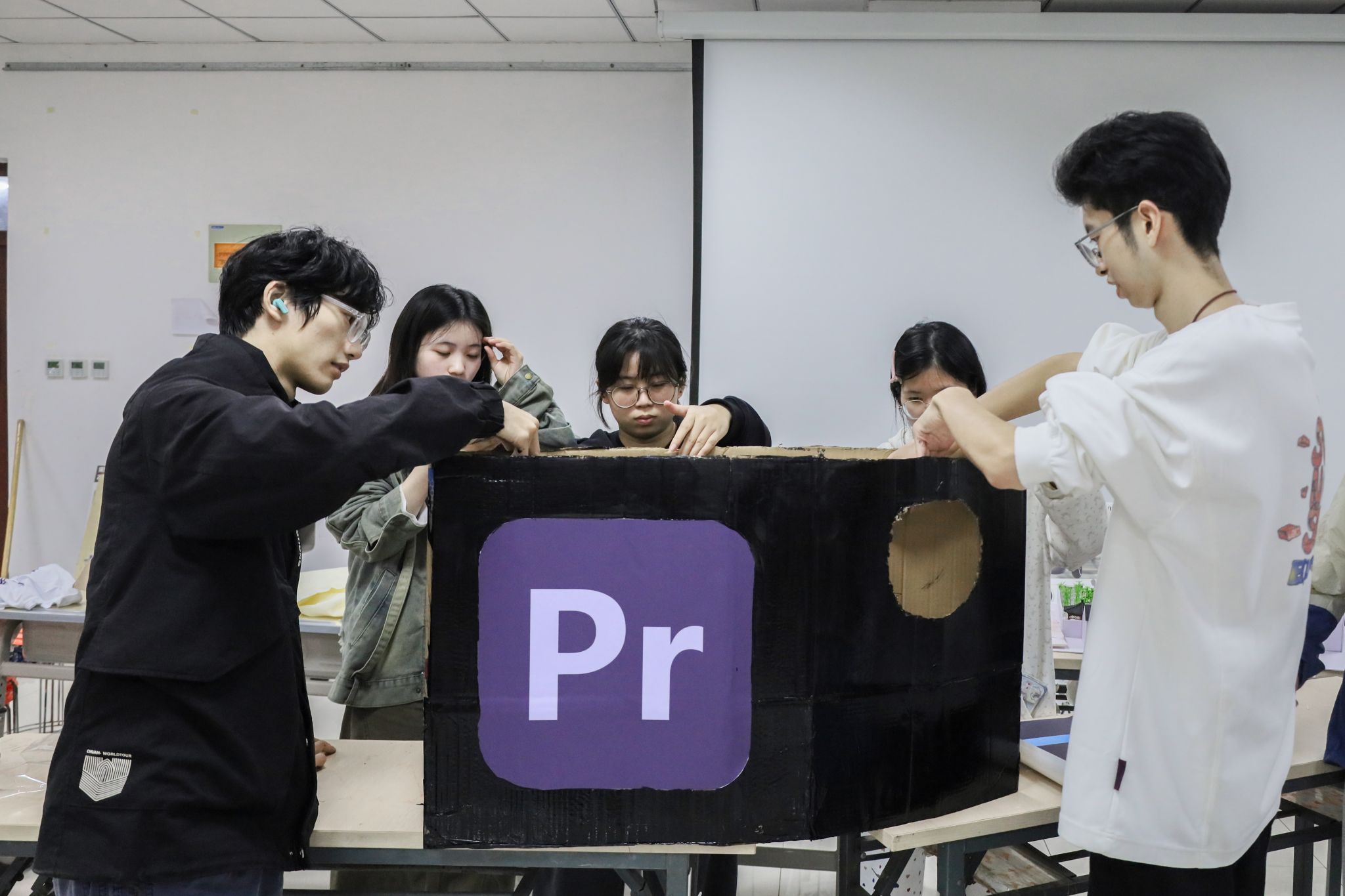先将纸板进行内部粘贴,再在纸板的两侧进行裁剪,然后涂抹上我们美术所用的颜料,最后贴上设计学所用的一些软件图片。设计学专业2025(3)班的宋云飞按照标准的步骤,一丝不苟的制作着创意纸箱。他表示,大家配合默契,学长学姐组织得力且耐心解答疑问。“整个过程大家热情有干劲,从纸板粘贴、裁剪到颜料涂抹、贴软件图片,每一步都凝聚着团队的实践智慧。”宋云飞提到。