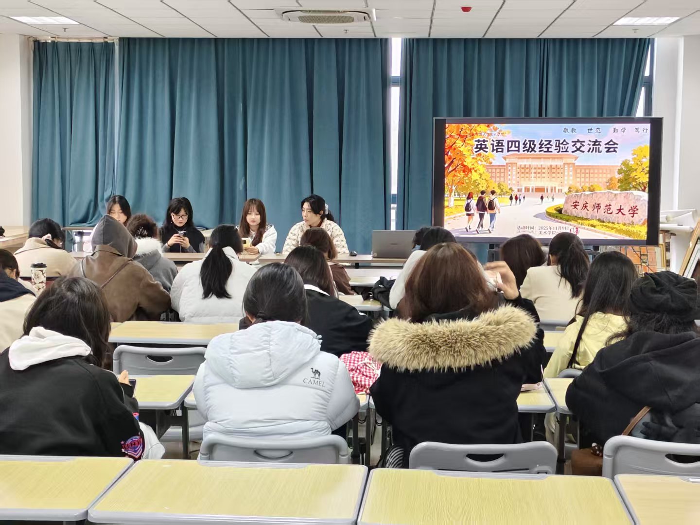11月9日,tyc122ccvip员工会在新美术楼P210举办英语四级考试经验交流会,活动邀请了tyc122ccvip4名已经通过英语四级考试的同学进行经验交流和分享,2025级新生参加了此次活动。