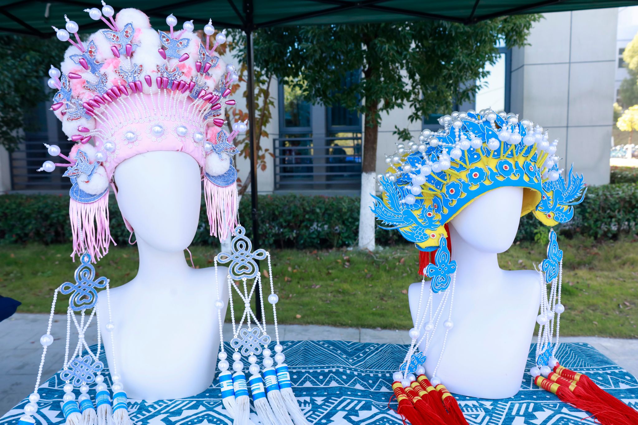 走进展区,美美“薪”传美育工作室的手工盔帽率先抓人眼球,银线云纹缠绕帽檐,仿点翠饰片流光溢彩;六尺巷主题文创套装里的典故插画鼠标垫、徽派建筑钥匙扣同样吸睛,让非遗以趣味形式贴近青年。“我们想让非遗走出课本,让年轻人感受传统工艺魅力。”团队成员介绍,现场不仅有完整盔帽展品,师范生特制的拆分部件可作京剧文化教学教具,脸谱作品也紧扣美术课程面具制作内容,实现非遗传承与师范教育的有机融合。
