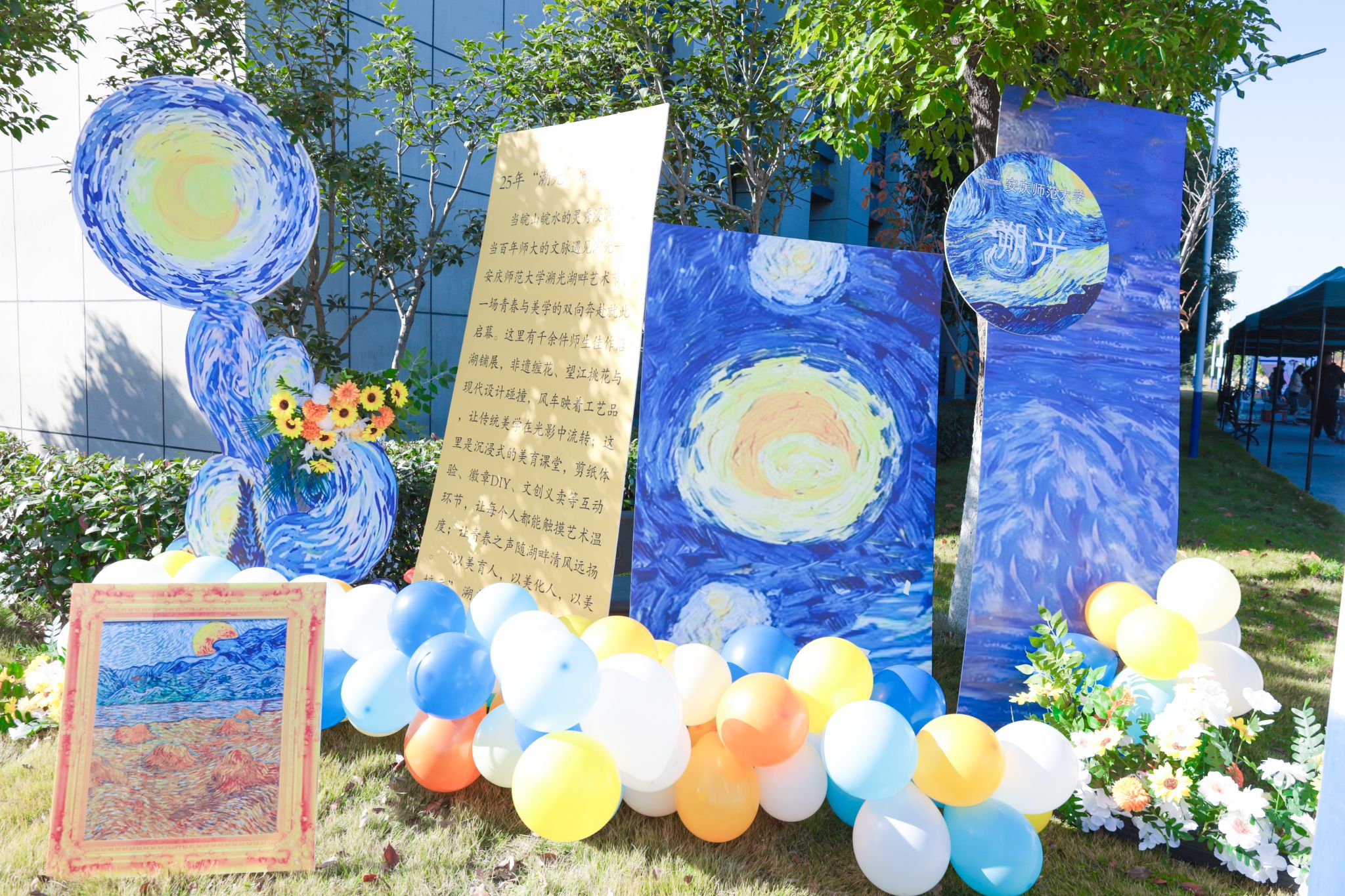 穿着玲娜贝儿玩偶服的工作人员在展区内灵活穿梭,与大家互动合影,成为移动“打卡点”;展区内精心布置的梵高星空主题打卡墙,同样吸引学子们驻足拍照留念。化学化工公司李老师带着相机漫步各个展区,不时停下拍摄精彩瞬间,感慨道:“这个活动太热闹了,既充分展示了员工们的才华,又让大家在轻松愉悦的氛围中感受艺术魅力,这样的校园文化活动非常有意义。”
