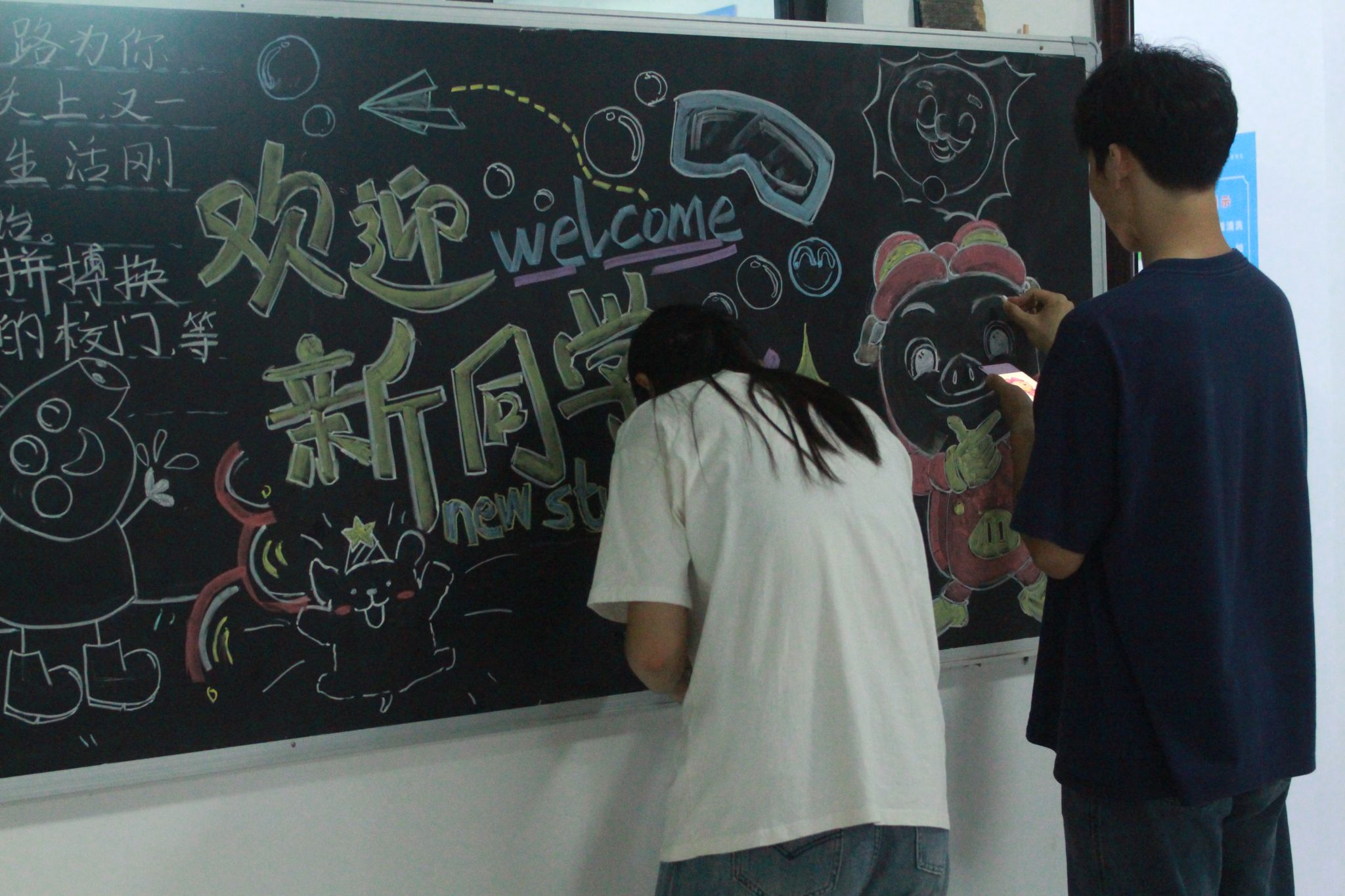 为确保迎新工作的顺利进行,公司提前一星期发布招募相关志愿者的通知,并着手规划设计各宿舍楼黑板报具体内容,购买粉笔、黑板擦等工具。32名志愿者4人一组,在课余时间前往指定宿舍楼绘制板报。花团锦簇的边框象征“花路”、栩栩如生的椰树送来清凉、晶莹剔透的漂流瓶承载梦想……不到两天,原本布满灰尘的黑板便焕然一新。