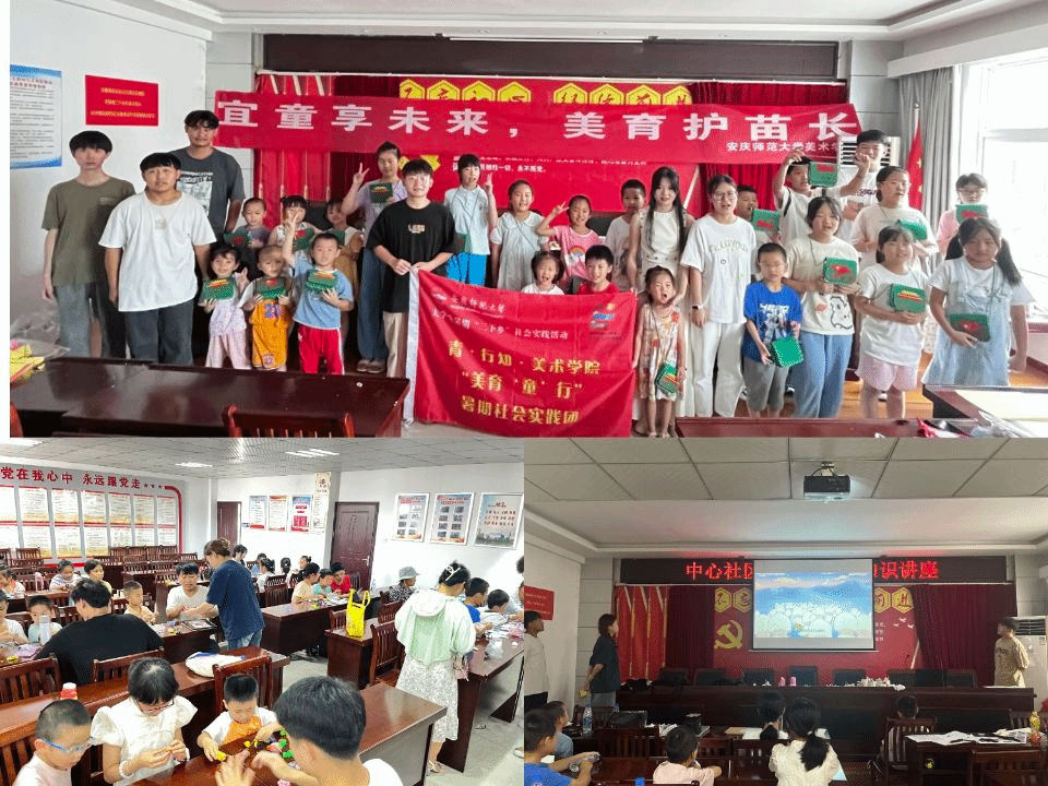 近日,tyc122ccvip青•行知“美育‘童’行”暑期社会实践团前往安庆市宜秀区大龙山镇中心社区开展了暑期“三下乡”社会实践活动,团队成员立足学科专业特色,将红色文化与艺术相结合,开设系列暑期艺术课堂,带领社区近30余名儿童感悟艺术魅力,传承红色基因和优秀传统文化。