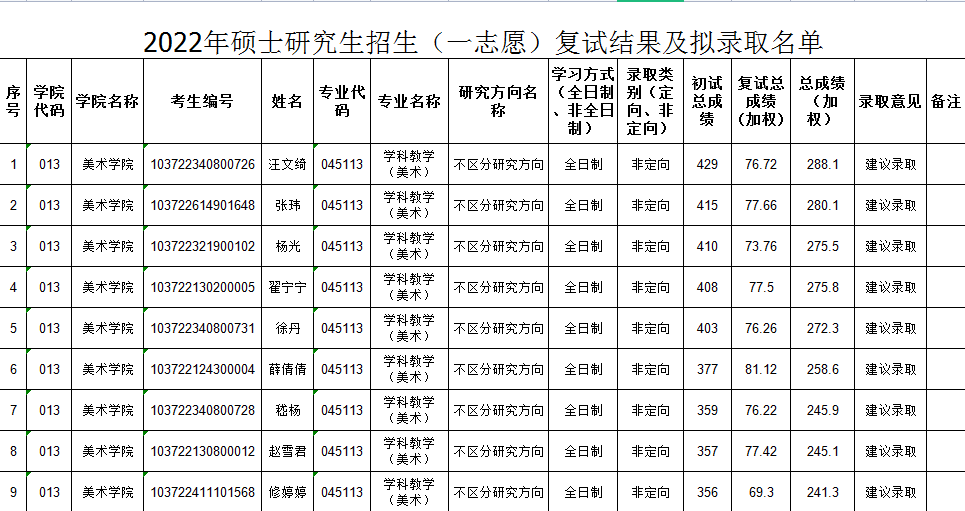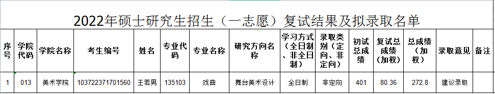 tyc122ccvip学科教学(美术)和戏曲专业舞台美术设计方向一志愿拟录取结果如下: