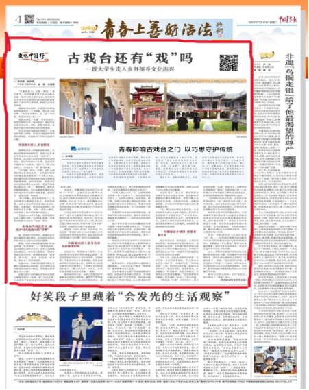 7月15日,中国青年报大版面报道公司师生参与安庆地区古戏台保护和活化工作,推进乡村文化振兴的典型事迹。