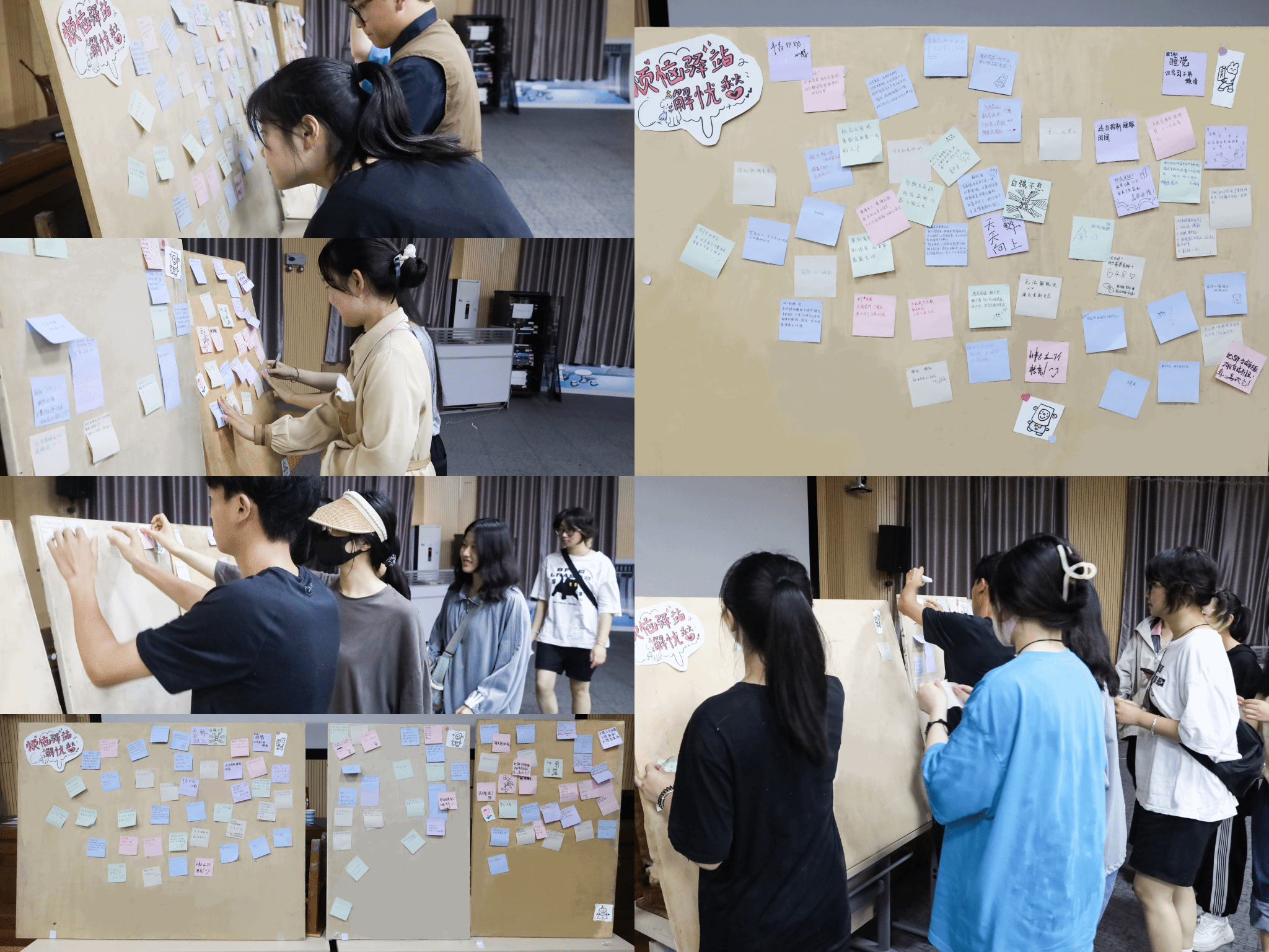 “在‘5.25’心理健康节来临之际,希望大家以轻松愉快、自由畅谈的方式感受集体的温暖。”活动负责人、美术学专业2021(2)的毕唯依介绍,同学们以匿名形式将烦恼与困惑写在便利贴上,同时选取展板上的其他“烦恼”给出建议,在自己释放情绪、收获方法的同时传递温暖。